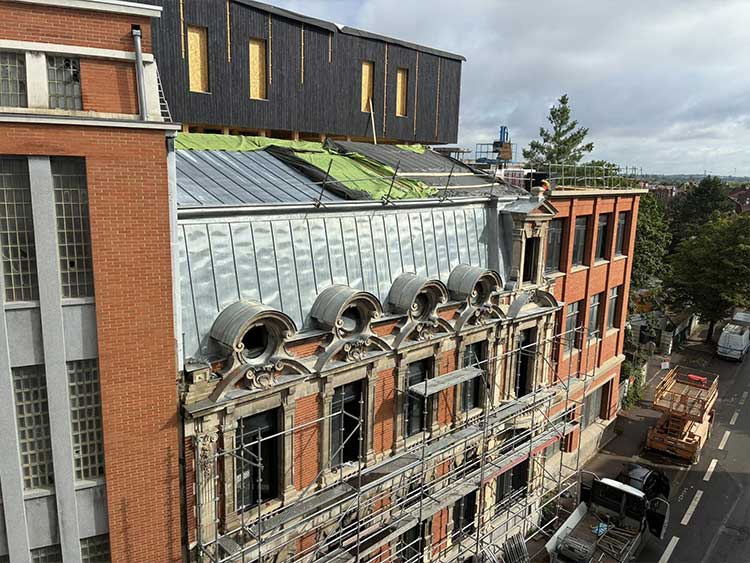 Toiture membrane PVC et zinc naturel pour cet atelier à Lille.